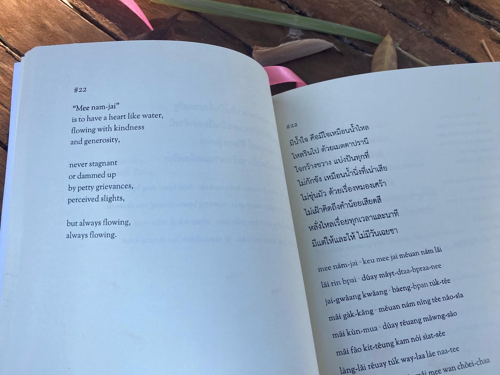 หนังสือเล่มนี้มาพร้อมคำอ่านทับศัพท์ภาษาไทย เพื่อให้ผู้อ่านทั้งชาวไทยและต่างชาติสามารถดื่มด่ำกับบทกวีรัก บทกวีเพื่อชีวิต และจิตวิญญาณพุทธที่สะท้อนวัฒนธรรมอีสานได้อย่างลึกซึ้ง