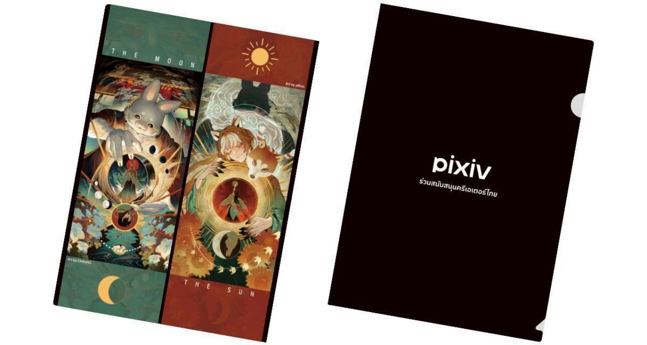 แฟ้มใสลายออริจินัล “THE MOON” และ “THE SUN” ที่รังสรรค์โดย CHINRO ศิลปินชื่อดังชาวไทยเจ้าของรางวัลชนะเลิศการประกวดวาดภาพของ pixiv เนื่องในโอกาสจัดอีเวนต์ “COMIC SQUARE8”