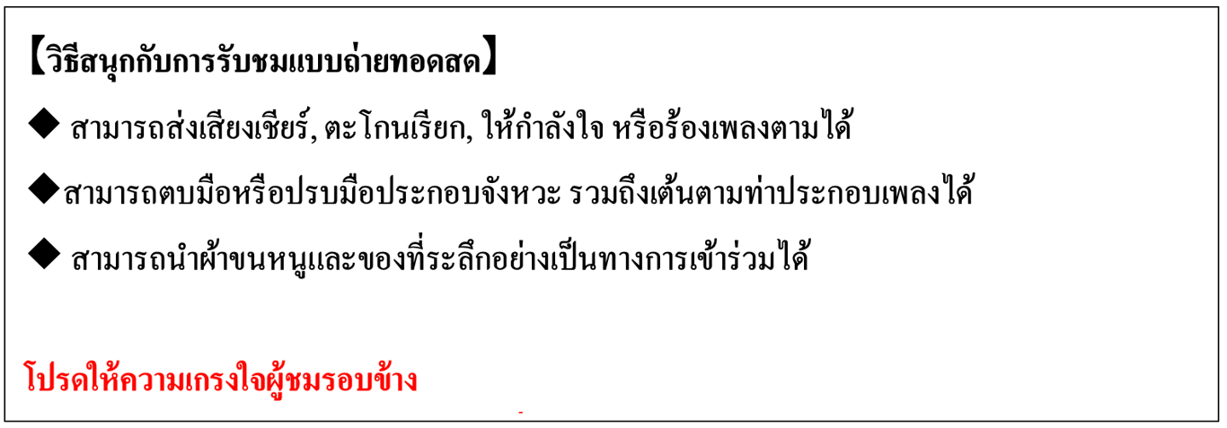 ※ โปรดใช้ความระมัดระวังในการใช้อุปกรณ์เชียร์( เช่น แท่งไฟเรืองแสง ผ้าขนหนู ฯลฯ) เพื่อไม่ให้รบกวนการรับชมของผู้ชมท่านอื่น